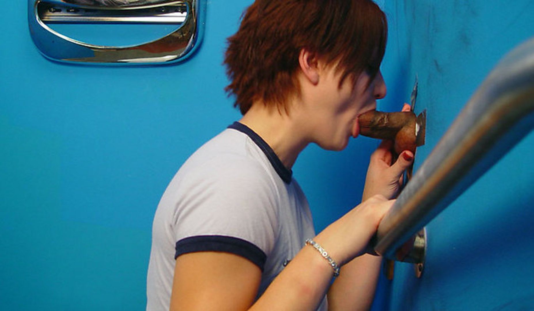 Next on the menu is Hailey. She's the kind of girl that is straight edge, avoids trouble, and waits until she gets home to use the restroom. It was in her bad fortune that she drank way too much soda and home is too far away to wait. With hesitation in her eyes Hailey's just about to unzip her pants when confronted with a black dick. It's not just a black dick. It's a black dick that's coming through the hole in the wall and it's as wide as one of her legs. Hailey's face turns even whiter and shock and and confusion overcome her. She calls his bluff by dropping to her knees, and swallowing all he has to offer. The 'tramp stamp' she's sporting is the true marking of a slut that's only concerned with sucking him off to completion. Her college of interracial porn comes in handy since she seems to know exactly how to handle that dinosaur-sized dick. Hailey's mouth reaps the reward of over 20 minutes of ball sucking, dick draining, staff stroking mayhem and she wouldn't have it any other way.
